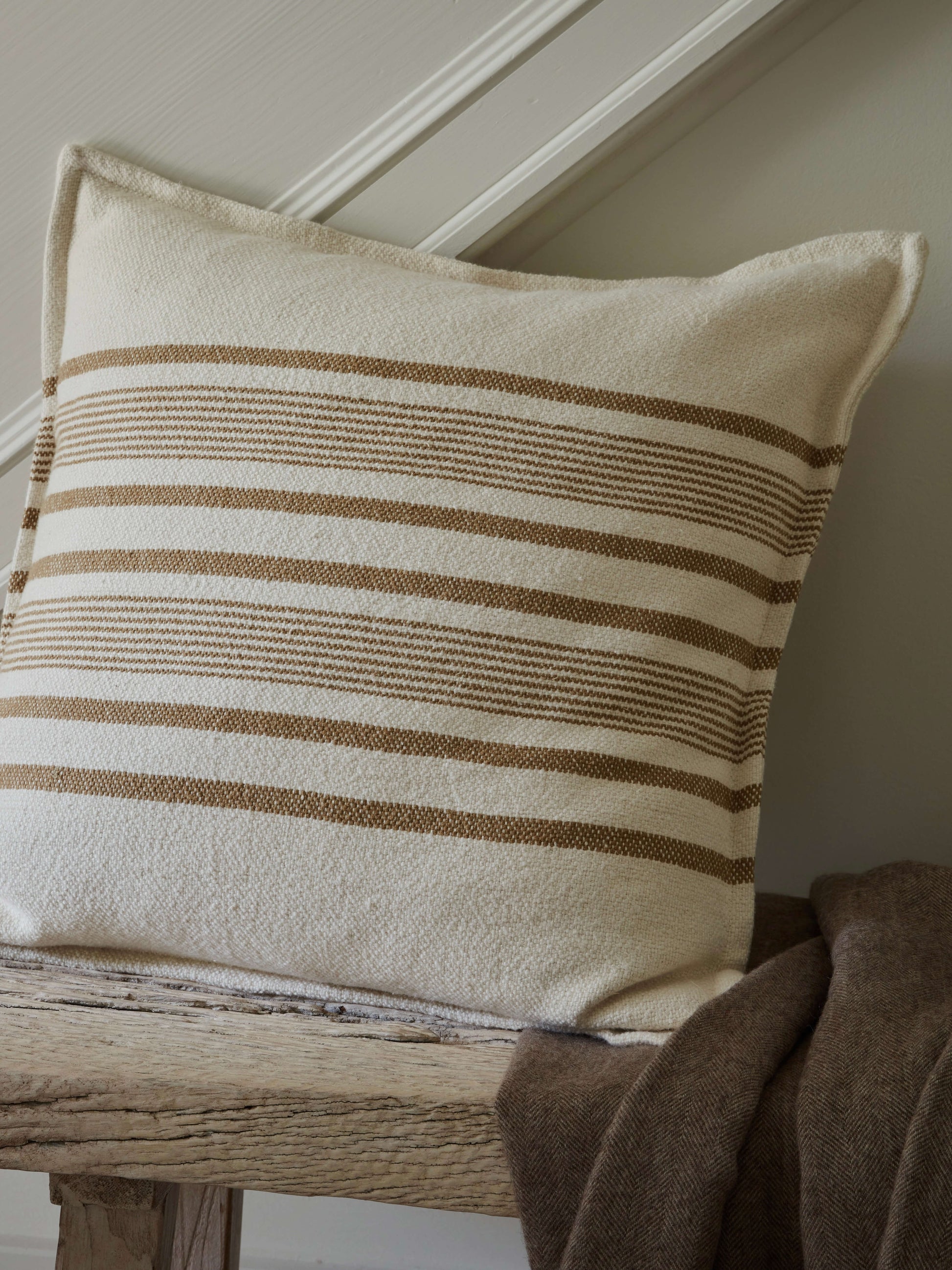 Add some lovely stripes to your sofa with this cream and camel cushion. Made from heavier linen and finished with a smart edge, this is a real beauty. Combine with the plain coloured camel and cream cushions to complete the look.