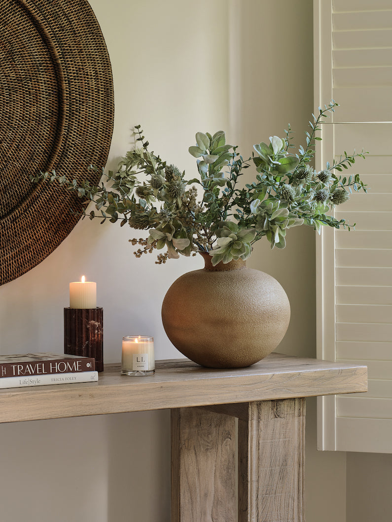 Create a wintery atmosphere with this stunning and simplistic bouquet. A high end look which combines our faux lamb's ear with real touch leaves with thistle and green eucalyptus. A structurally pleasing bouquet, ideal for a hallway to provide a warm welcome as you enter your home.