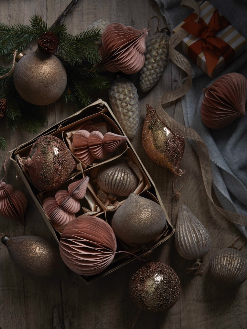 Add a touch of refined glamour to your tree this season with our gorgeous set of three large textured glass baubles. In a burnished gold colour, the surface has been given a speckled glass finish which makes them shimmer against your fairy lights. The set of three contains one of each shape shown.